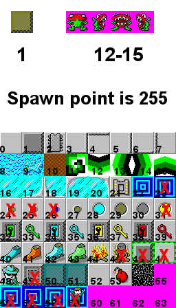 - The box and teeth in the top go into the second, entity set of data, while the tiles on the bottom go in the first, tile set of data. "X"s are used on tiles which don't function. (Forgot to put one on 9, btw) Also, Teeth will only collide with blocks 1, 10, and 54. I never completely finished their AI.
